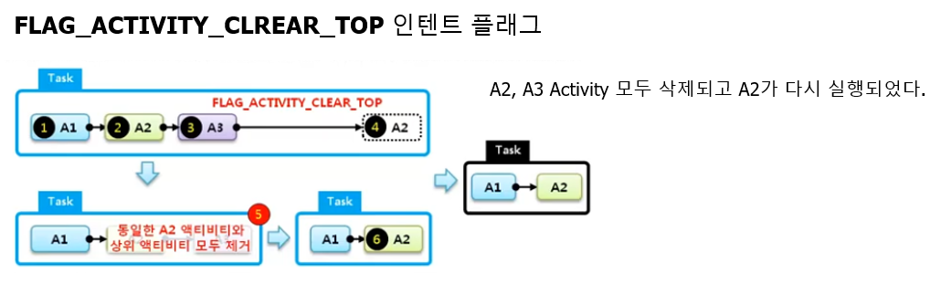 | val intent = Intent(this, MainActivity::class.java) intent.addFlags(Intent.FLAG_ACTIVITY_CLEAR_TASK or FLAG_ACTIVITY_NEW_TASK) // FLAG_ACTIVITY_CLEARTOP : 실행할 activity가 이미 스택에 존재하면 해당 activity 위에 존재하는 다른 activity 모두 종료시킨다. // FLAG_ACTIVITY_SINGLE_TOP : 호출하는 activity가 자신을 가리키는 경우, 기존의 activity를 재활용한다. // 활동의 인스턴스가 이미 현재 작업의 맨 위에 있으면 시스템은 활동의 새 인스턴스를 생성하지 않고 // onNewIntent() 메서드를 호출하여 인텐트를 기존 인스턴스로 라우팅한다. // https://developer.android.com/guide/components/activities/tasks-and-back-stack 읽어보면 된다. // FLAG_ACTIVITY_CLEAR_TASK : // FLAG_ACTIVITY_NEW_TASK : service, notification 등에서 액티비티를 시작하기 위해선 꼭 붙여야 한다. // 스택에 없으면 새로운 task 생성하고 launch 시키고, 스택에 있으면 해당 task가 Foreground로 온다. startActivity(intent) finish() // 현재 activity 제거. login 화면은 다시 사용하지 않도록 하기 위해서 |