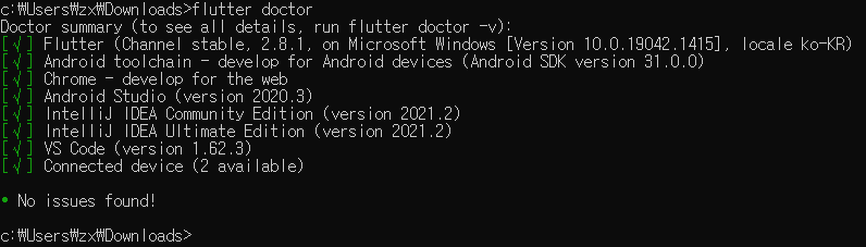 아래 그림과 같이 이슈가 없다면 Flutter 설치는 준비된 것이다.