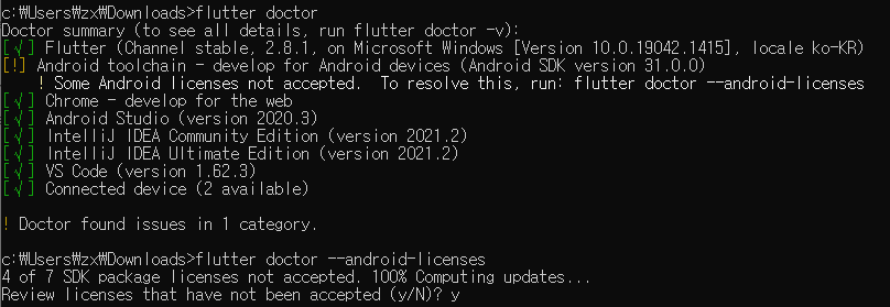 CMD 창을 열고 flutter doctor 를 실행하니까 아래와 같이 나온다.