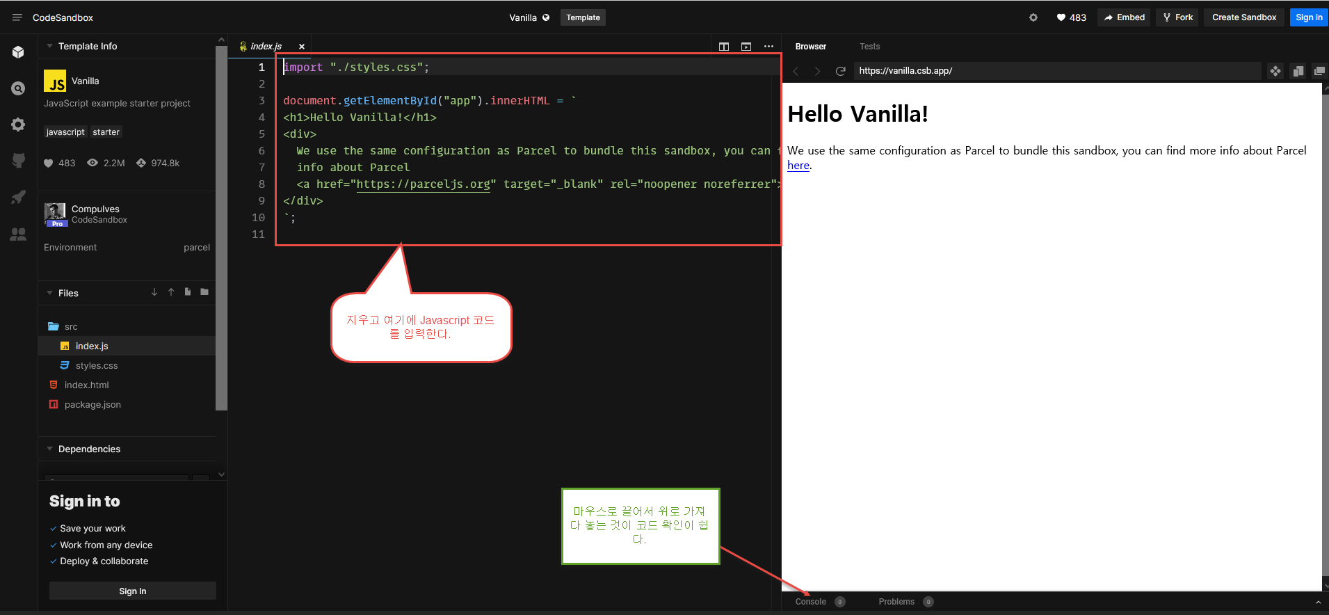 프로그래밍 학습이나 교육에 활용하면 좋은 온라인 코드 에디터 CodeSnadbox 를 이용하는 방법이다.