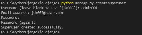 - admin.py 에 코드를 추가하고 나서 python manage.py createsuperuser 를 해서 Username, Email, Password 를 등록한다.