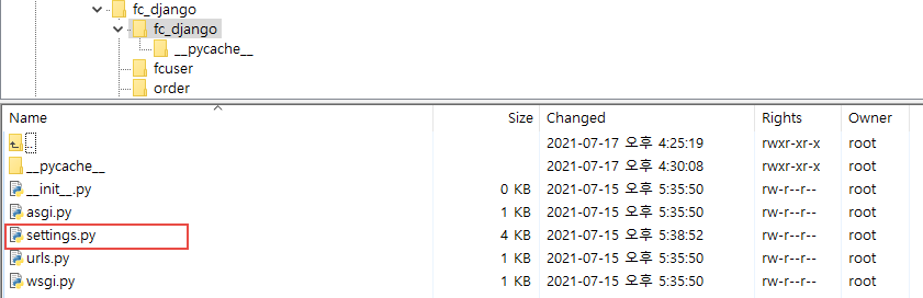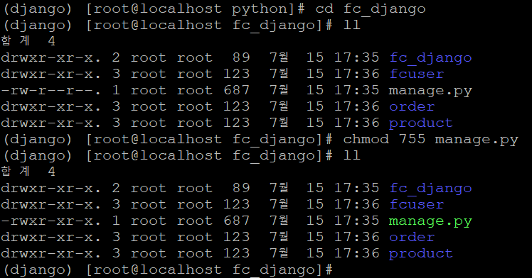 윈도우에는 실행권한이 있는 파일 구분이 없기 때문에 manage.py 파일이 644 권한이다.