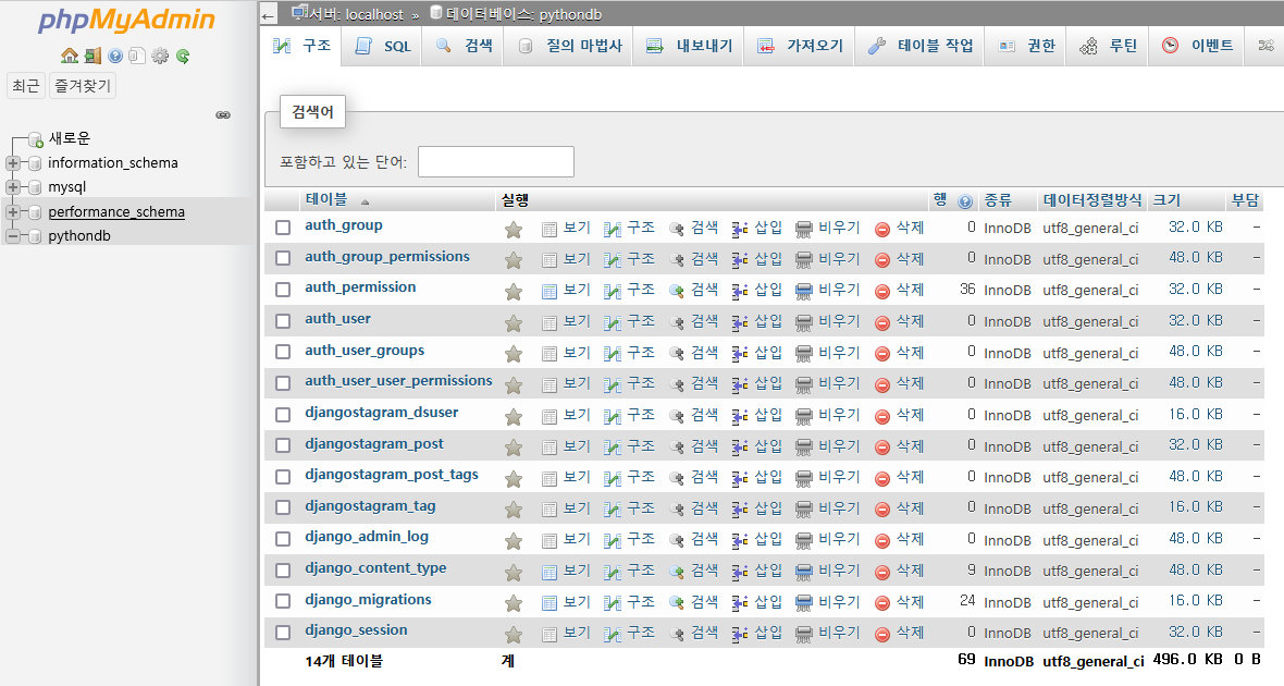 pythondb 에 테이블이 생성된 것을 phpMyAdmin 을 이용하여 확인해봤다.