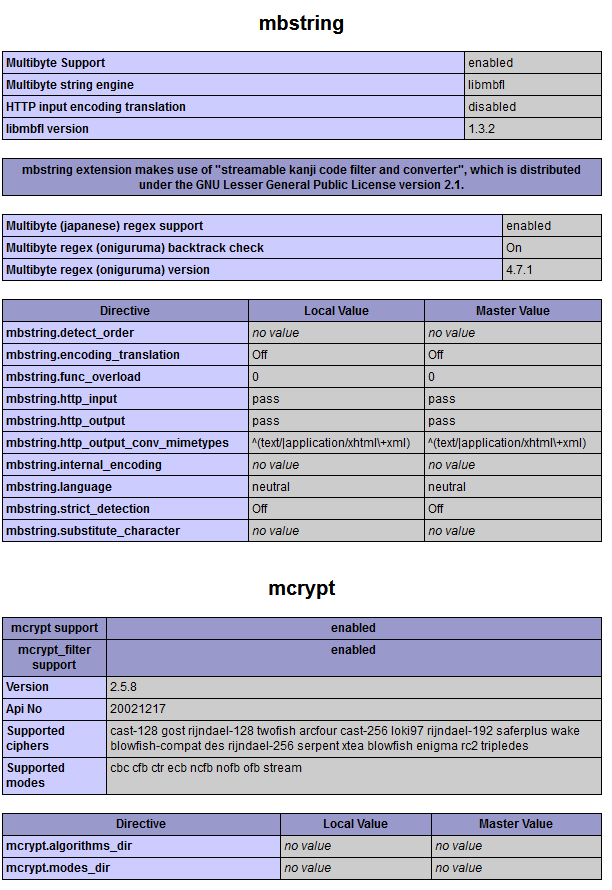 PHPINFO 로 확인해보니 mcrypt.so 파일과 mbstring.so 파일이 설치되어 있지 않았다.