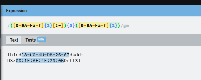 * 문자열에서 패턴에 맞는 문자열 즉 맥주소를 뽑아낸다.