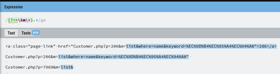 /(?<=\&m\=).+/g 를 하면 &m= 뒷부분을 전부 찾아준다.
