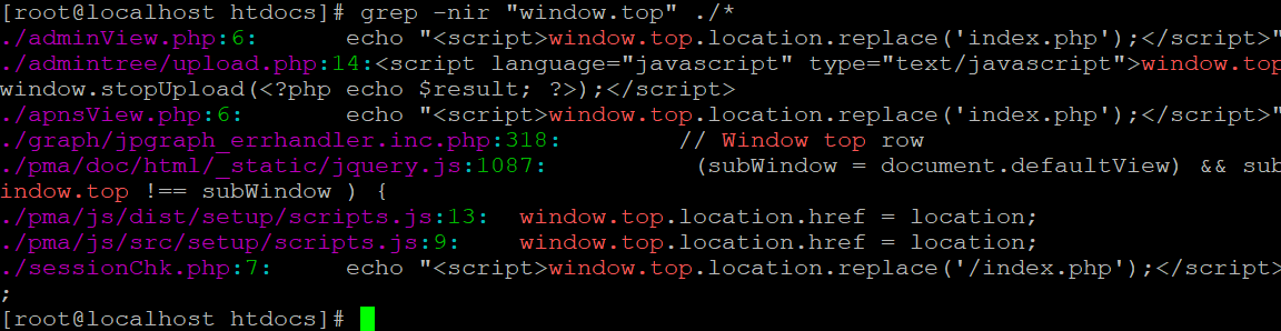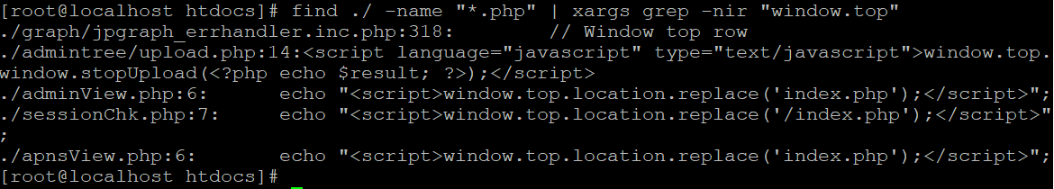 find ./ -name "*.php" | xargs grep -nir "window.top"