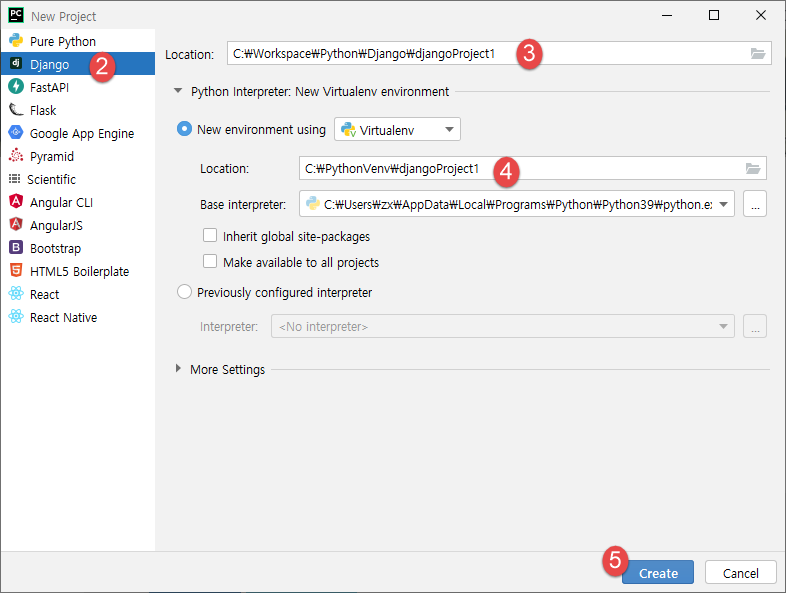 파이참(PyCharm)을 이용해서 장고 프로젝트를 생성하는 과정을 적어둔다.