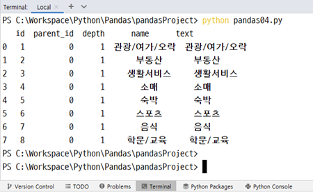 MariaDB 에서 SQL 데이터를 읽어서 Pandas DataFrame 에 출력하는 코드이다.