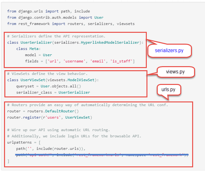 아래 그림처럼 파일을 각각 분리하여 serializers.py, views.py, urls.py 로 분리하여 넣는다.