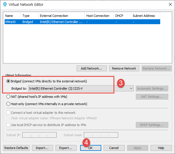 VMnet0 가 bridge 모드로 설정하는 옵션