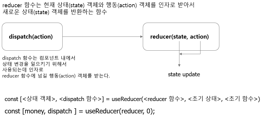 - reducer : state와 action를 받아 새로운 state를 반환하는 함수