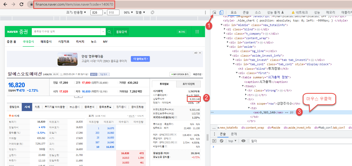 가장 먼저 해야 할일은 크롬 브라우저에서 개발자 모드(F12) 상태에서 원하는 정보를 클릭하는 것이다.