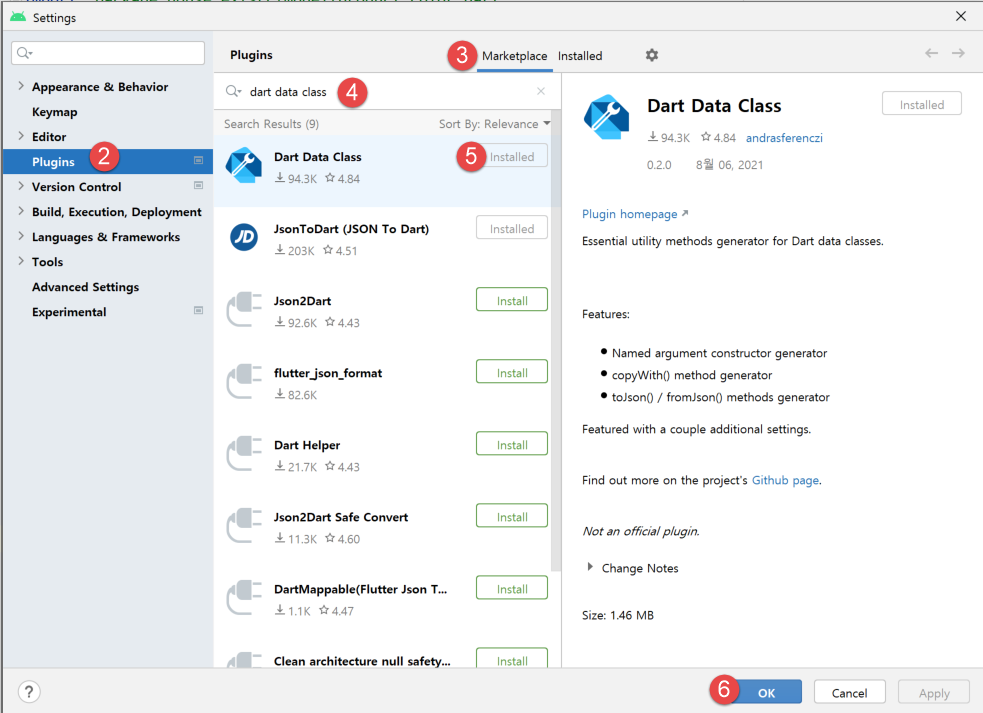 Plugins 탭을 누르고 MarketPlace를 선택한 다음에 dart data class 를 입력하면 검색 결과가 나온다.