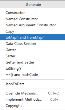 toMap() and fromMap()은 자동 생성한 후에 toJson() 과 fromJson 으로 용어 변경을 해주고 세부적인 사항은 수정해주면 된다.