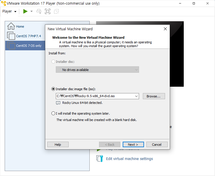 먼저 Rocky-9.5 버전의 DVD ISO 파일을 받아둔 경로를 선택한다.