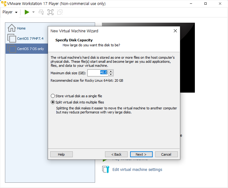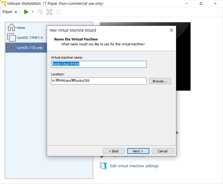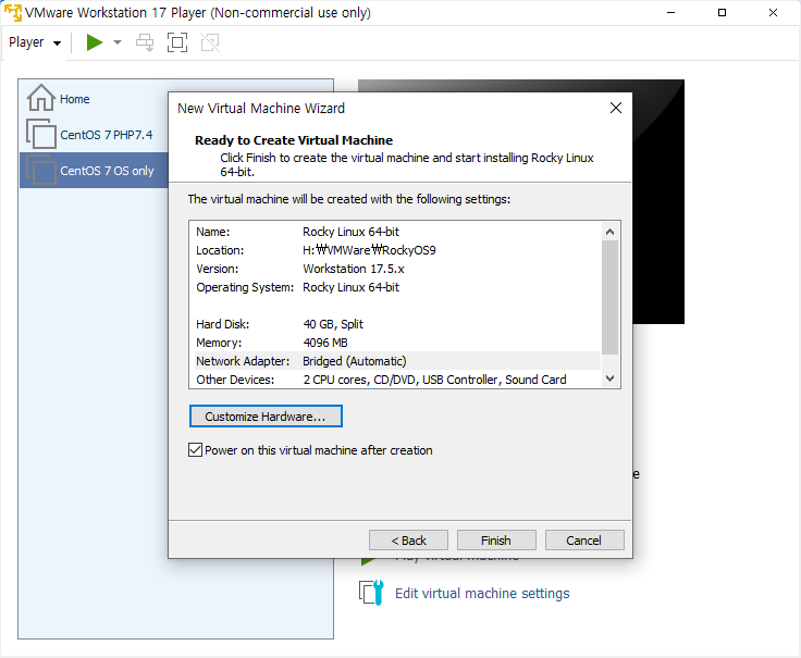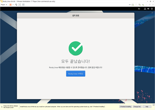 VMWare 에 Rocky Linux 9 버전을 설치하는 과정을 캡쳐한 이미지이다.