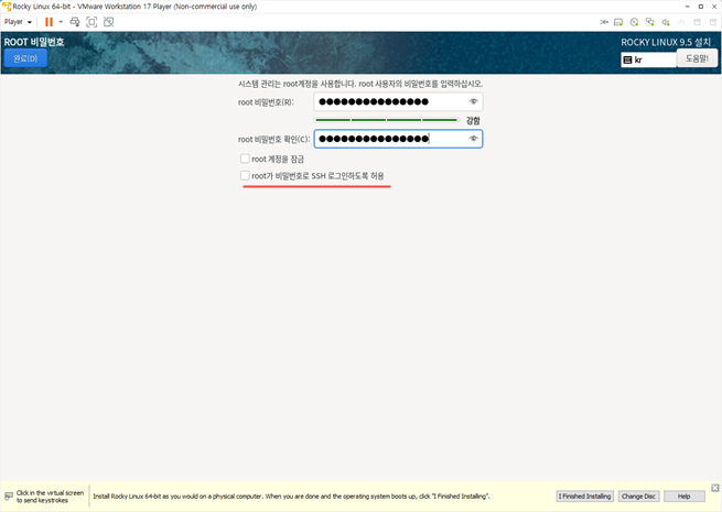 root 비밀번호를 설정하고 아래 그림의 빨간줄을 선택하지 않으면 SSH root 로그인은 안된다.
