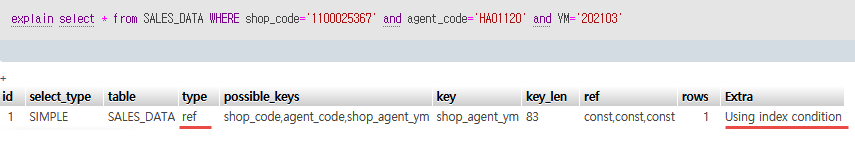 해당 쿼리문이 인덱스를 타는지 안타는지 알기 위해서는 쿼리문 앞에 |