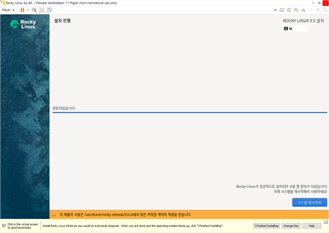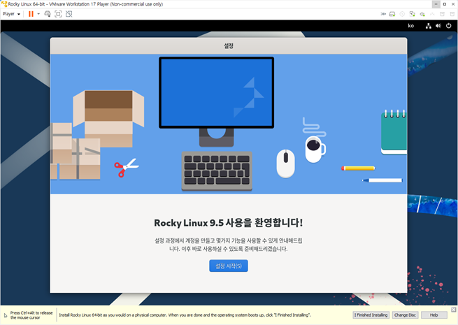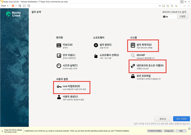VMWare 에 Rocky Linux 9 버전을 설치하는 과정을 캡쳐한 이미지이다.