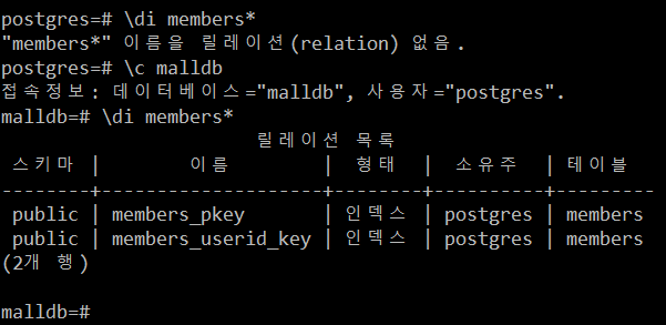 \c malldb -- 해당 DB에 접속한 후 실행