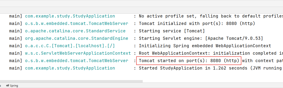 실행버튼을 누르면 컴파일 되고 Tomcat 이 8080포트로 구동되었다는 걸 확인할 수 있다.