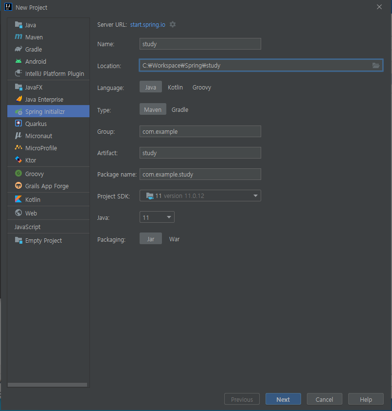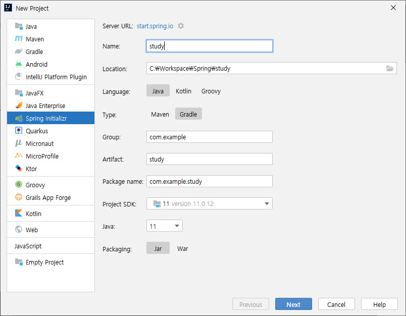 Type 을 Maven 대신 Gradle 로 선택한다.