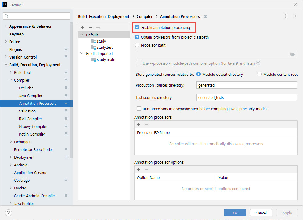 Settings -> Build, Execution, Deployment -> Annotation Processors