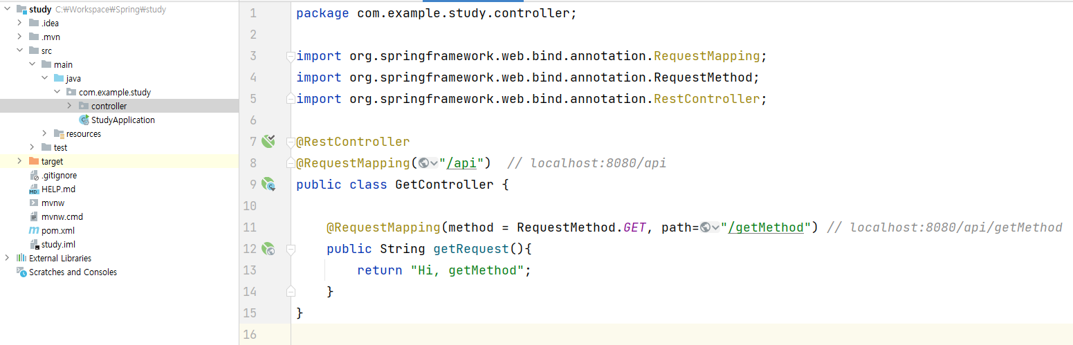 @RequestMapping(method = RequestMethod.GET, path="/getMethod") // localhost:8080/api/getMethod