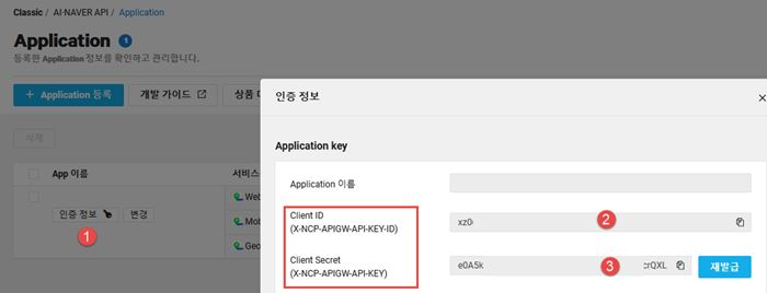 https://link2me.tistory.com/1832 를 참조하고, geocoding API 를 신청하고 나서 인증정보를 눌러보면 아래와 같은 key 정보를 알 수 있다.